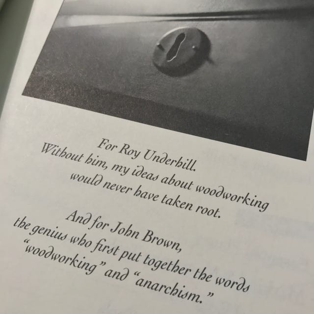 John Brown was the first person to put “woodworking” and “anarchism” together, and it was genius. Though I doubt his ideas and mine about anarchism were similar, I am forever in debt to him for making that connection. That is why I dedicated “The Anarchist’s Tool Chest” to him and Roy Underhill (another political subversive).
