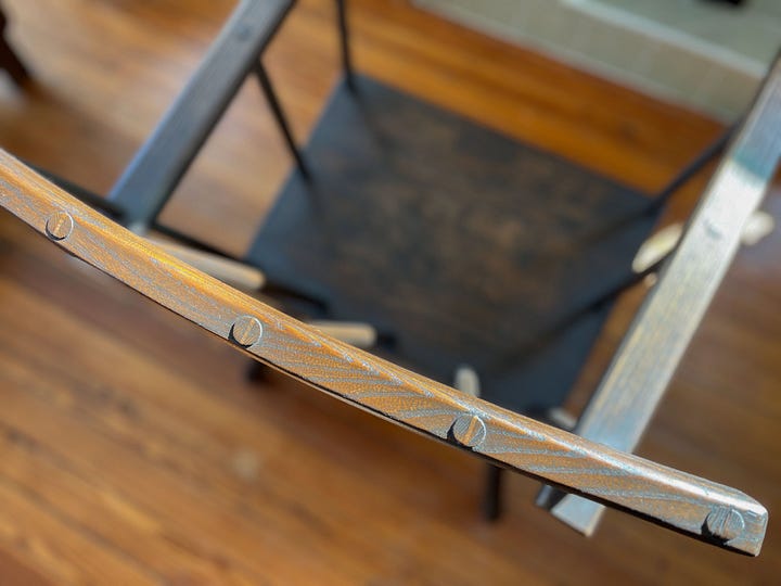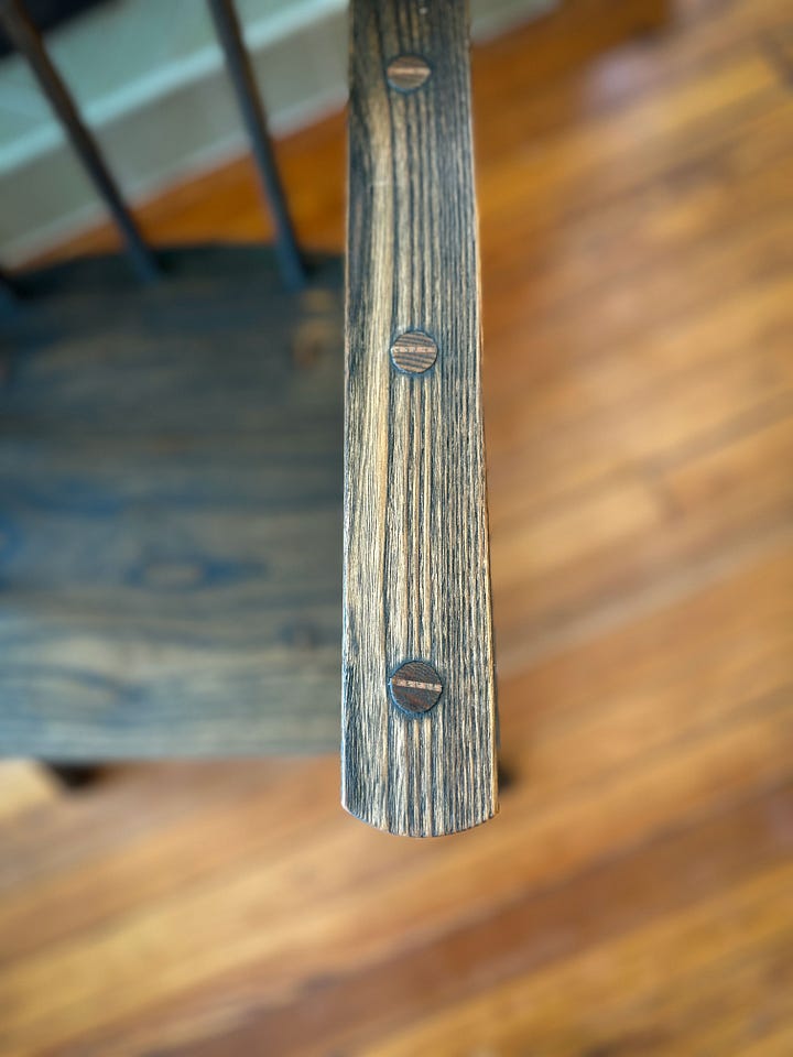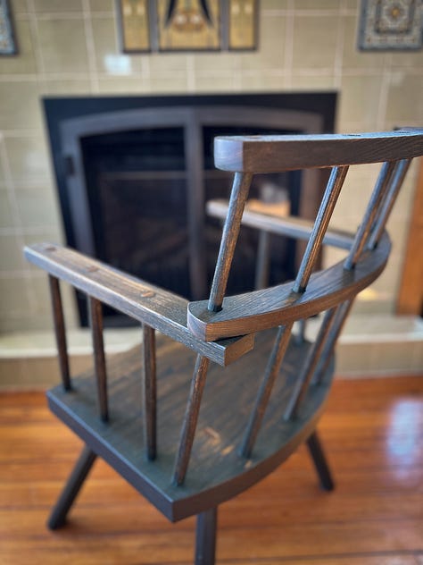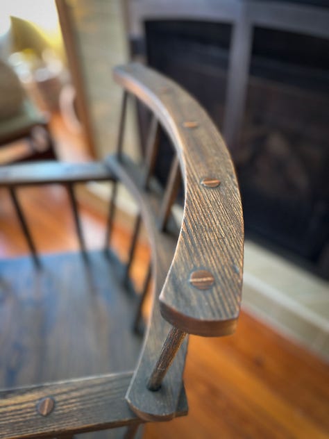 All the wedged tenons are left a bit proud (maybe 1/16") and burnished with steel to remove any hard edges and polish them. This chair doesn’t look like an old chair. But it will soon.