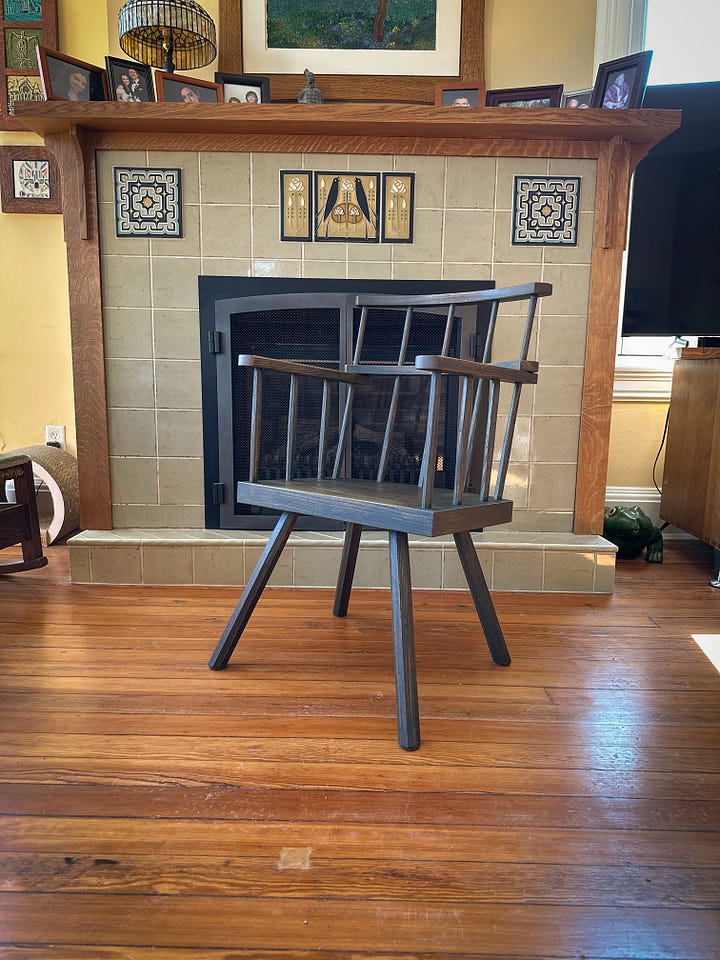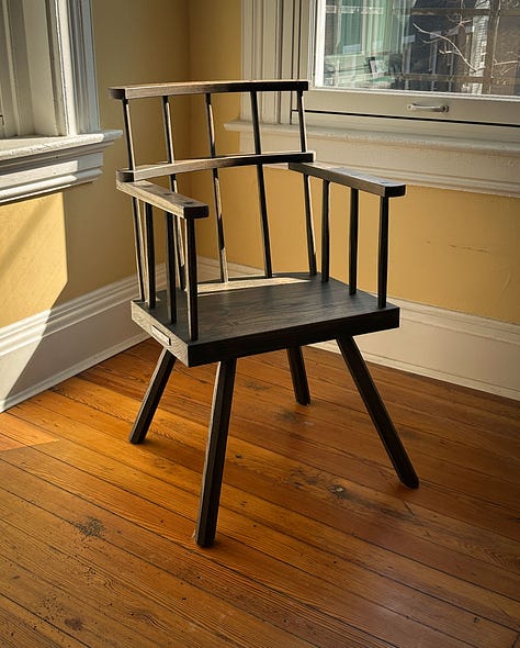 I first encountered this form of Irish chair in a barn in Slane, Ireland (thank you Mark Jenkinson for the Guinness stew). It’s a remarkably compact and comfortable chair. Stout in its own way. And finished with soot, green pigment and oil.