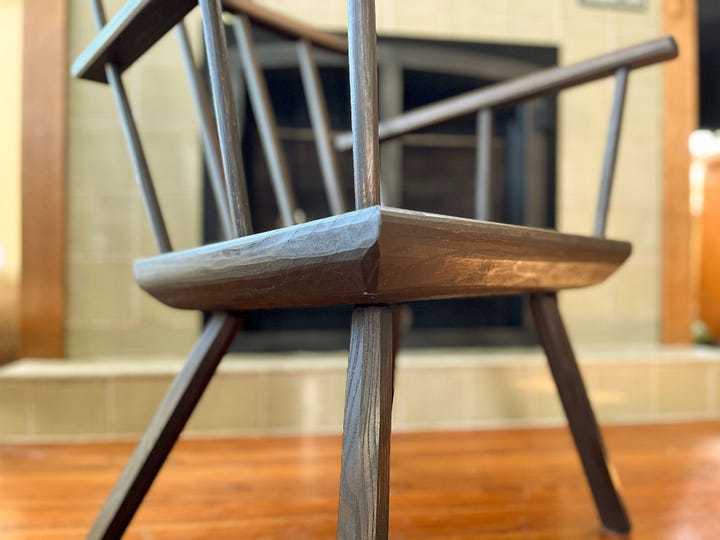 The rest of the chair is American elm, a tenacious and somewhat glowing species of wood that I love for building chairs. Like all my chairs, all the surfaces are finished with handplanes, spokeshaves and knives. The facets are left crisp. But there are no hard edges.