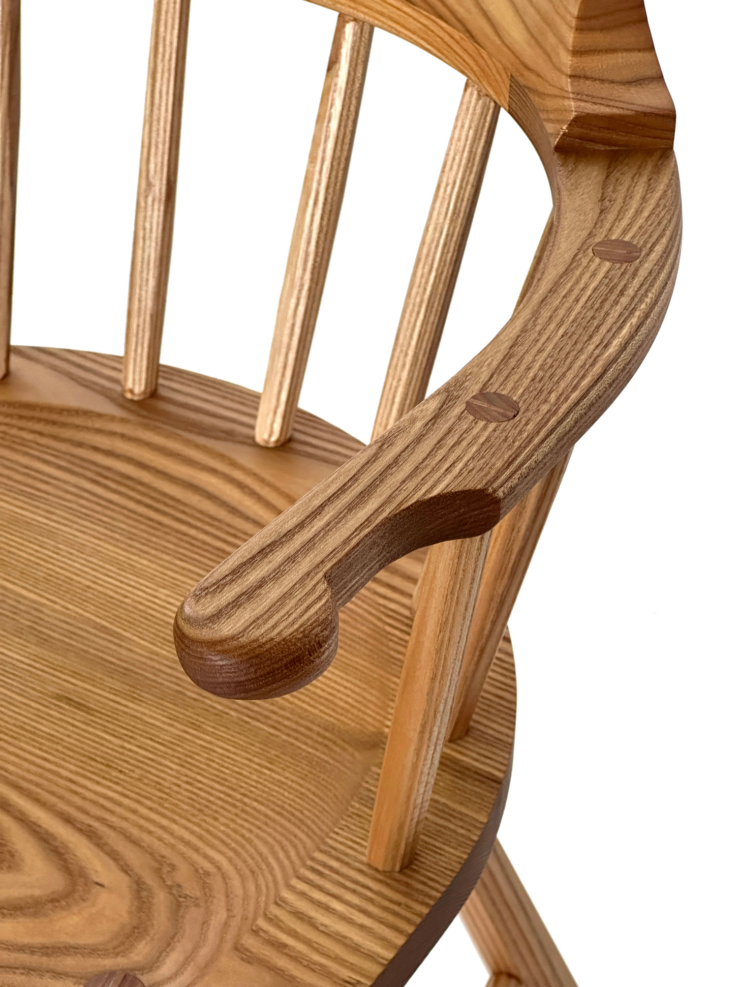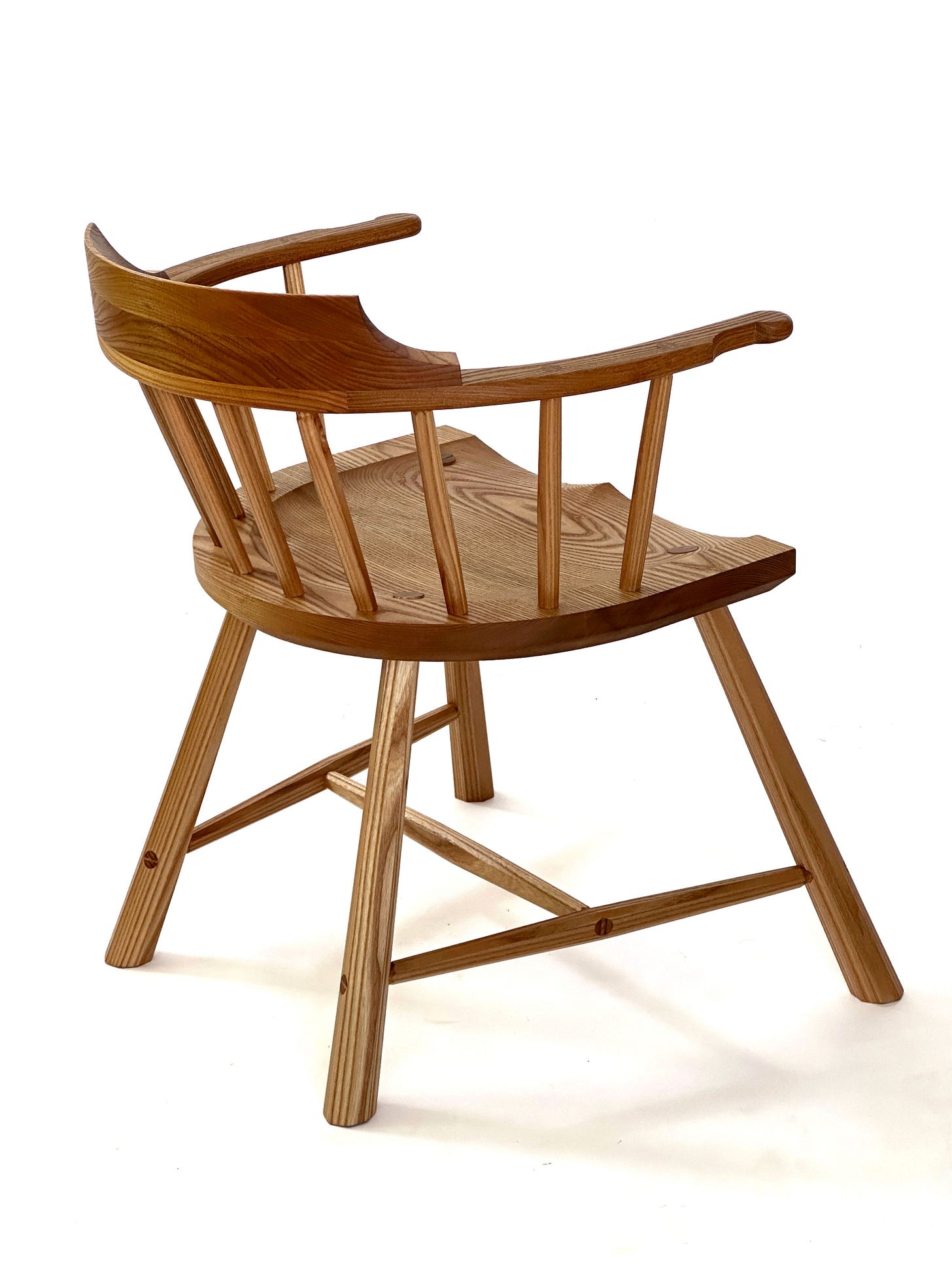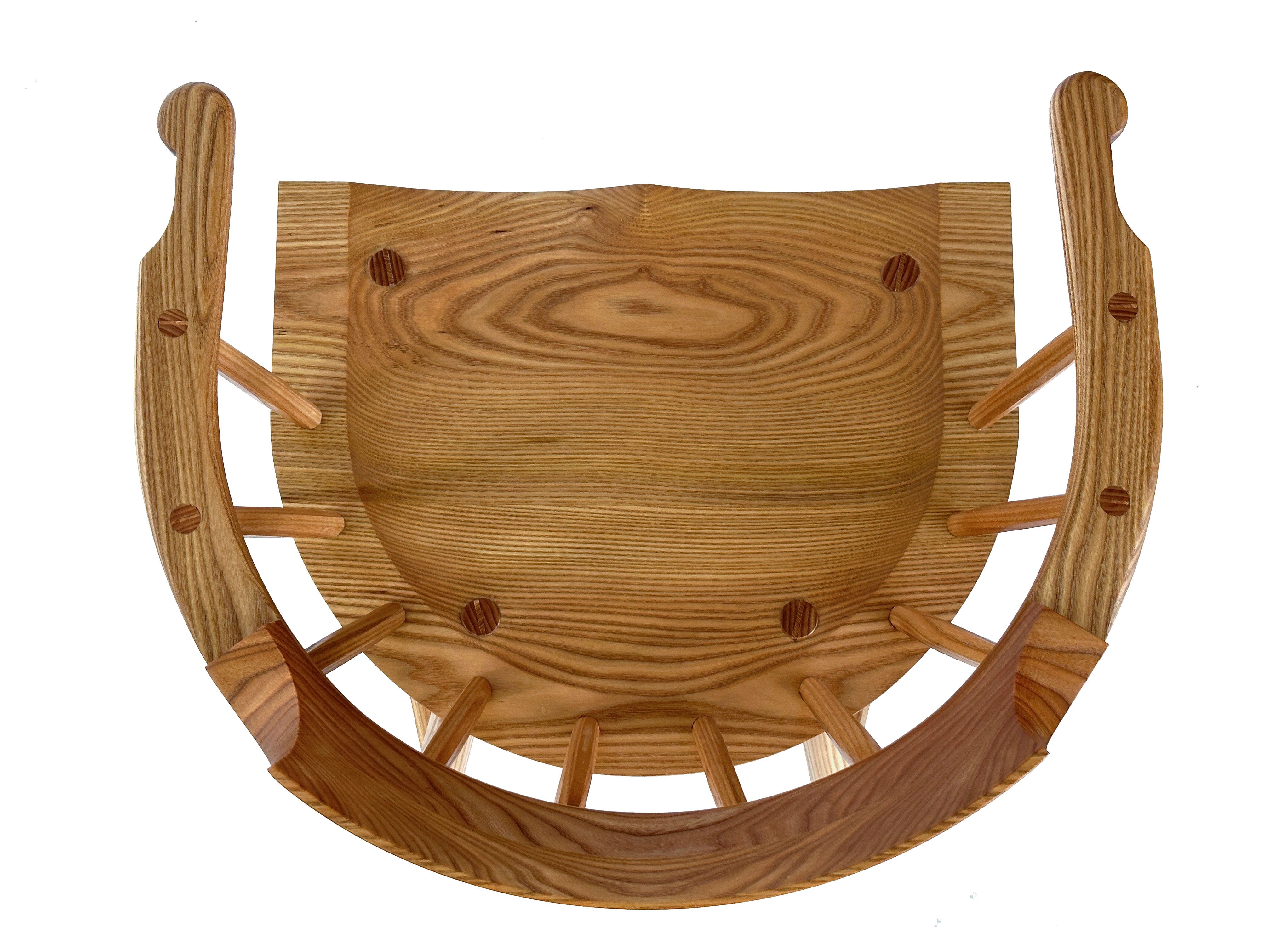 If you’re curious how this chair is different than the one in “The Stick Chair Book,” here are the major changes. The seat is thinner with a steeper (45°) underbelly. The arm is narrower (1-7/8”) without sacrificing any back support. The hands are an old shape that I now prefer and a bit longer. The undercarriage uses octagonal components, which are lighter and just as strong.